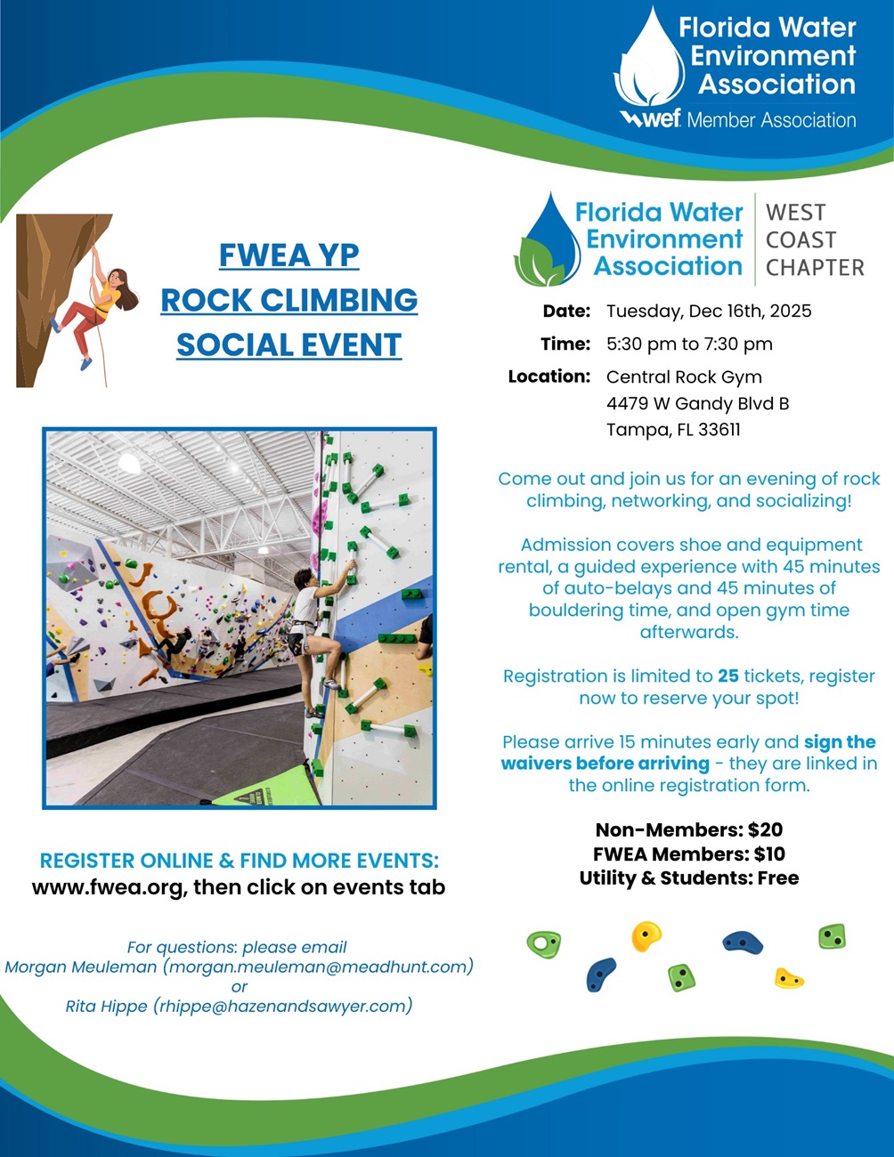 The 2025 Holiday Social for the FWEA First Coast Chapter and FSAWWA Region II Chapter will be held on December 11, 2025 at Aardwolf Brewing Company starting at 6pm. Please bring an unwrapped gift toy to the event to help us support the Toys for Tots Foundation. more info...