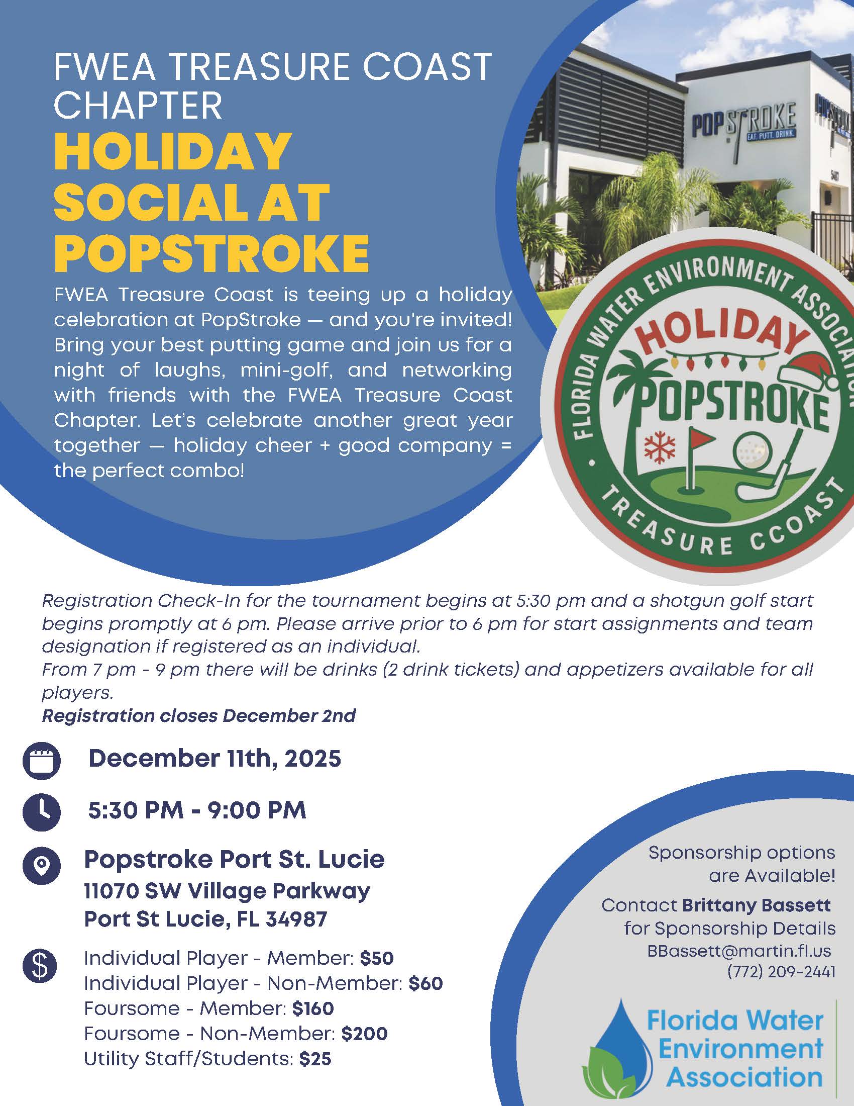| 12/11/2025 | Join the FWEA Treasure Coast Chapter for a fun evening at Popstroke Port St. Lucie. Registration for the tournament begins at 5:30pm and golfing begins promptly at 6pm. Please arrive prior to 6pm to be designated in your groups. From 7pm-9pm there will be two drink tickets for all players and appetizers available. Registration closes December 2nd. more info... |