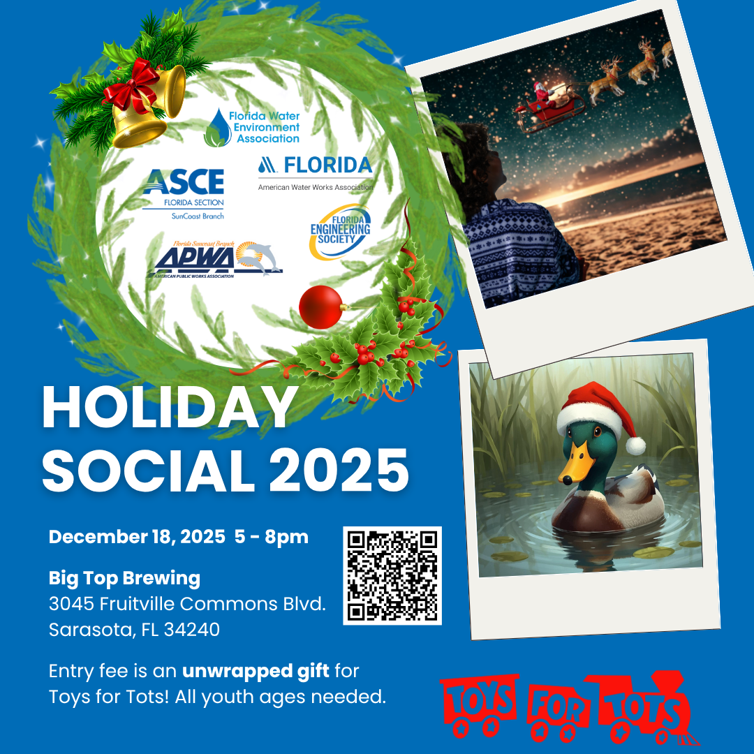 The 2025 Holiday Social for the FWEA First Coast Chapter and FSAWWA Region II Chapter will be held on December 11, 2025 at Aardwolf Brewing Company starting at 6pm. Please bring an unwrapped gift toy to the event to help us support the Toys for Tots Foundation. more info...