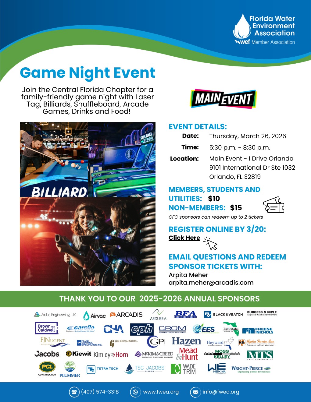 | 3/26/2026 | Join the FWEA Central Florida Chapter for a family-friendly evening with laser tag, billiards, arcade games, drinks, and food! This Social is a chance to connect with fellow water professionals while enjoying an evening of events.