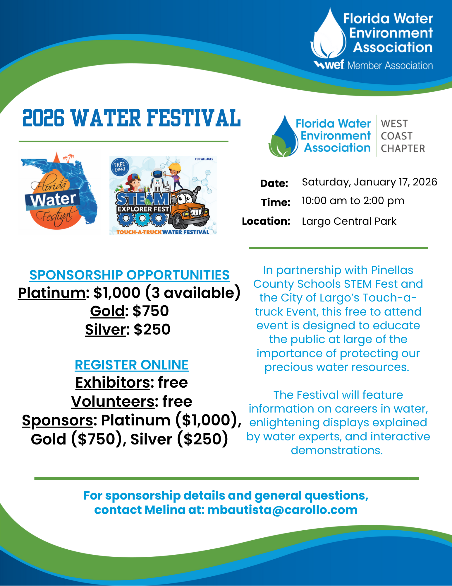 Events available for Registration... FWEA Global Sponsorship for FY2025/26 4/11/2025 - 2/15/2026 register for this event... Biosolids Committee Sponsorship for FY2025/26 4/12/2025 - 2/15/2026 register for this event... Central Florida Chapter Sponsorship for FY2025/26 4/12/2025 - 2/15/2026 register for this event... Emerging Water Technologies Committee Sponsorship for FY2025/26 4/12/2025 - 2/15/2026 register for this event... First Coast Chapter Sponsorship for FY2025/26 4/12/2025 - 2/15/2026 register for this event... Manasota Chapter Sponsorship for FY2025/26 4/12/2025 - 2/15/2026 register for this event... Operations Challenge Sponsorship for FY2025/26 4/12/2025 - 2/15/2026 register for this event... PCOC Committee Sponsorship for FY2025/26 4/12/2025 - 2/15/2026 register for this event... Safety Committee Sponsorship for FY2025/26 4/12/2025 - 2/15/2026 register for this event... Southeast Chapter Sponsorship for FY2025/26 4/12/2025 - 2/15/2026 register for this event... Southwest Chapter Sponsorship for FY2025/26 4/12/2025 - 2/15/2026 register for this event... Students and Young Professionals Committee Sponsorship for FY2025/26 4/12/2025 - 2/15/2026 register for this event... Treasure Coast Sponsorship for FY2025/26 4/12/2025 - 2/15/2026 register for this event... Utility Management Committee Sponsorship for FY2025/26 4/12/2025 - 2/15/2026 register for this event... Wastewater Process Committee Sponsorship for FY2025/26 4/12/2025 - 2/15/2026 register for this event... West Coast Chapter Sponsorship for FY2025/26 4/12/2025 - 2/15/2026 register for this event... WR3 Committee Sponsorship for FY2025/26 4/12/2025 - 2/15/2026 register for this event... Air Quality Committee Sponsorship for FY2025/26 5/1/2025 - 2/15/2026 register for this event... Collection Systems Committee Sponsorship for FY2025/26 5/1/2025 - 2/15/2026 register for this event... Contractor Committee Sponsorship for FY2025/26 5/1/2025 - 2/15/2026 register for this event... Collection Systems Committee Event Sponsorship 8/27/2025 - 2/17/2026 register for this event... WR3 Seminar Sponsorships 10/1/2025 - 4/30/2026 register for this event... Central Florida Chapter Burrow Café and Play Social 11/6/2025 register for this event... FWEA West Coast Chapter Quarterly Luncheon 11/6/2025 register for this event... Wastewater Process Annual Seminar 11/6/2025 register for this event... Tampa Bay Watch Oyster Reef Installation at MacDill Air Force Base 11/7/2025 Online Registration has closed for this event FWEA CFC & FSAWWA Region III - 2025 Annual Beach Cleanup 11/8/2025 register for this event... Central Florida Chapter Orlando Magic Game 11/10/2025 Online Registration has closed for this event FWEA West Coast Chapter Annual Soccer Tournament 11/15/2025 register for this event... Southwest Chapter S&YP Estero River Kayak Trip (11/15) 11/15/2025 register for this event... Engineers without Borders and FWEA Fundraising Event 11/18/2025 register for this event... Southeast Chapter Networking Happy Hour 11/19/2025 Registration is Coming Soon for this event UCF vs. OCU ? CFC/SEE Joint Tailgate Event 11/22/2025 register for this event... SCUD/FWEA Toys for Tots Event 12/4/2025 register for this event... FWEA Bucs Thursday Night Game 12/11/2025 register for this event... FWEA Treasure Coast Chapter Popstroke Tournament and Holiday Social 12/11/2025 register for this event... 2026 Water Festival 1/17/2026 register for this event... FWEA Leadership Development Workshop 2/1/2026 - 2/2/2026 register for this event... |